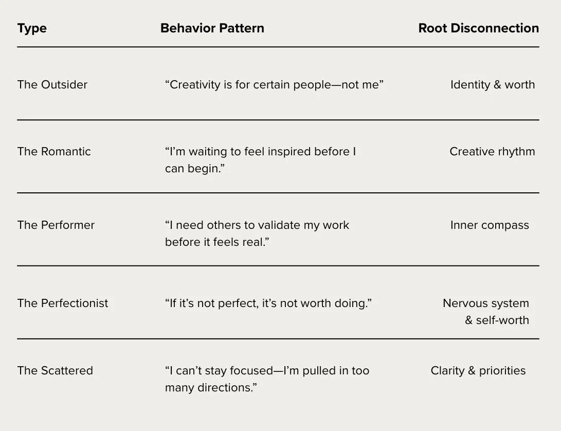 The 5 creative block types (The Outsider, The Romantic, The Performer, The Perfectionist, and The Scattered) each have their own root disconnection
