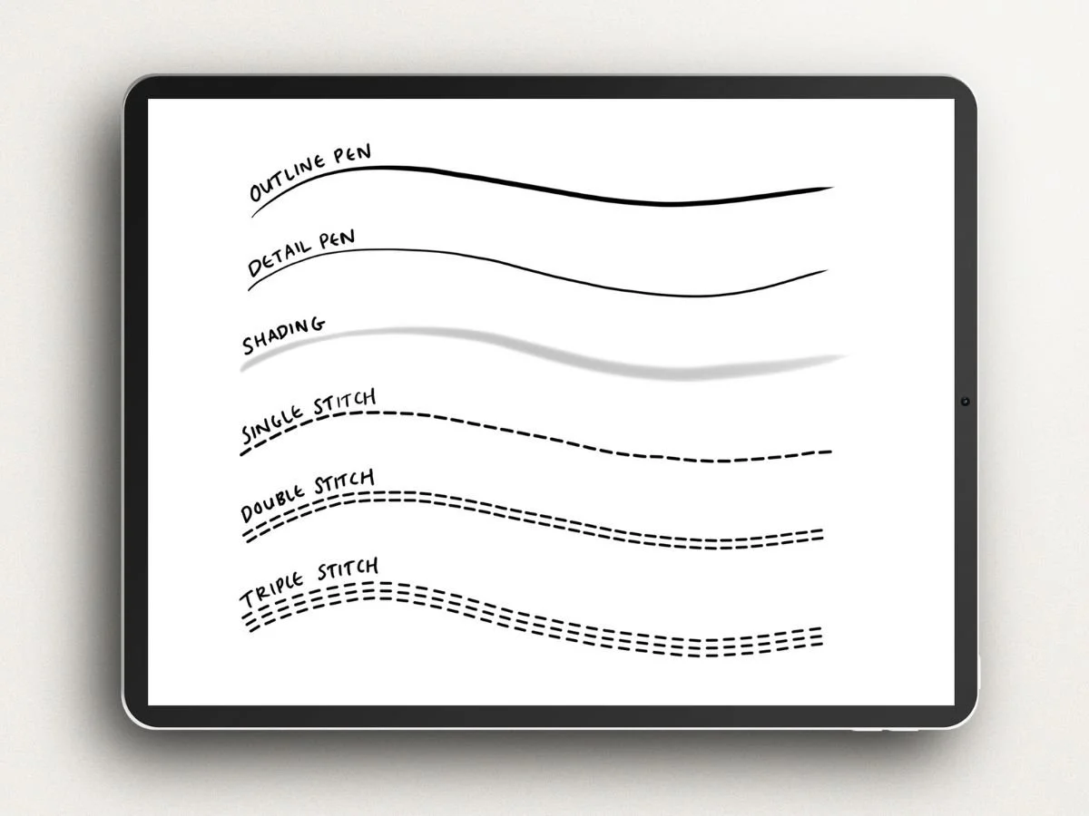 The Fashion Procreate Brushes include stitch lines, zipper teeth, buttons, trims, and more—designed to make your technical sketches cleaner and more detailed. The kit also includes custom designed outline and detail pens for precise lifework.